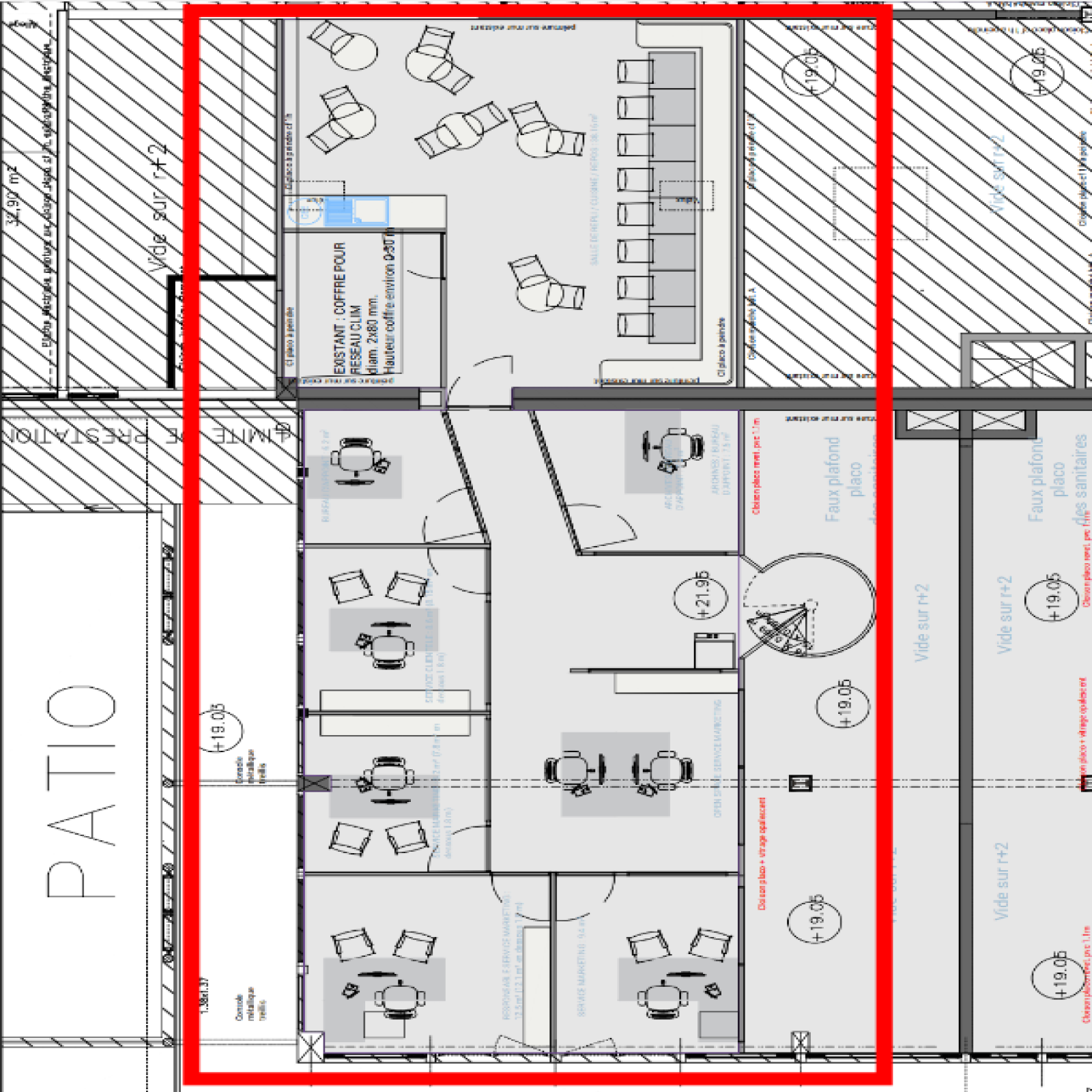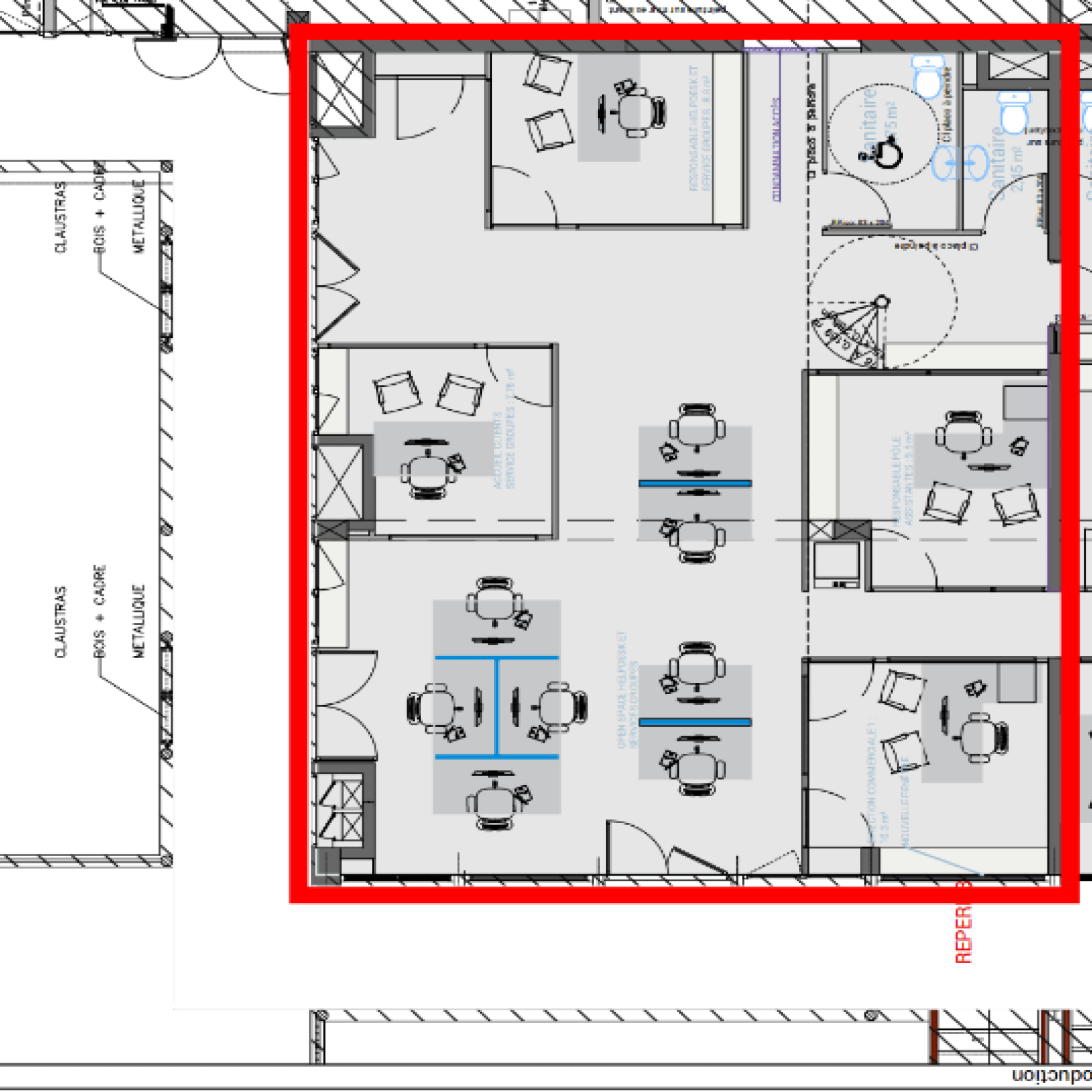 L'étage (130 m²) offre quant à lui une grande salle de réunion ou réfectoire, de six à sept bureaux d'une personne et du local serveur climatisé.